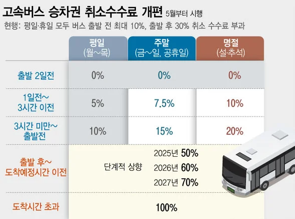 2025년 5월 1일부터 시행되는 고속버스 취소 수수료 개편안은 노쇼 문제를 완화하고, 실수요자들에게 더 많은 기회를 제공하기 위한 정책입니다.