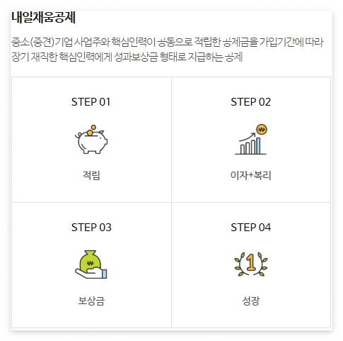 내일채움공제는 근로자가 본인의 월급에서 일정 금액을 적립하면, 기업과 정부가 이를 추가로 지원해 주어 만기 시 큰 목돈을 마련할 수 있는 구조입니다.