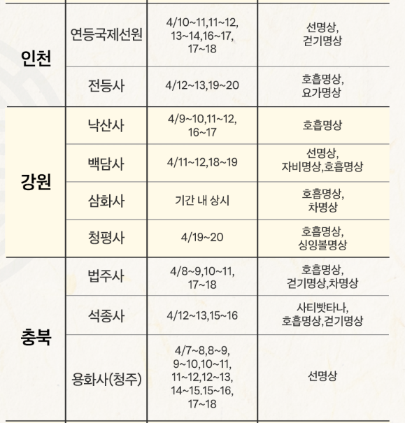 각 사찰마다 하루 또는 1박 2일 프로그램 등 구성도 다양하기 때문에 개인의 일정과 관심사에 따라 선택할 수 있습니다.