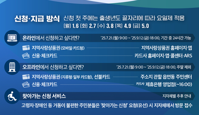 민생회복 소비쿠폰 신청은 신청 첫 주(7월 21일~25일) 동안 ‘출생년도 끝자리’에 따른 요일제가 적용됩니다