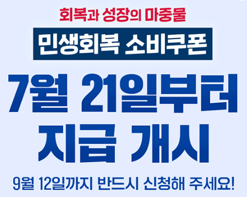 민생회복 소비쿠폰 신청 기간은 7월 21일(월) 9시 ~ 9월 12일(금) 18시까지 진행됩니다!
