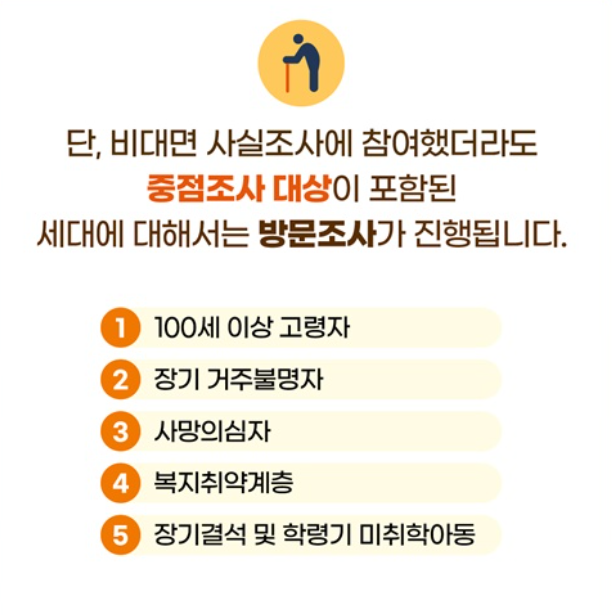 또한, 이번 2025 주민등록 사실조사에서는 중점조사 대상 세대에 한해 방문조사가 병행됩니다. 비대면 참여를 완료했더라도 아래와 같은 항목에 해당된다면 공무원 또는 이·통장의 방문이 이뤄질 수 있어요.